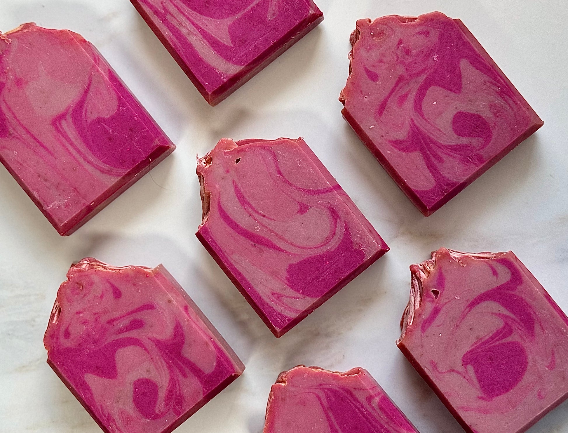 Ingredients: Distilled Water, Saponified oils of (Lard, Olive Oil, Coconut Oil, Shea Butter, Avocado Oil, Castor Oil) Sodium Hydroxide, Skin-safe Fragrance, Kaolin clay, Skin Safe Colorant, Titanium Dioxide.